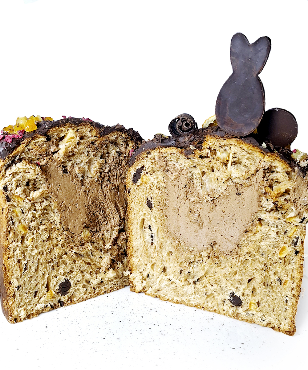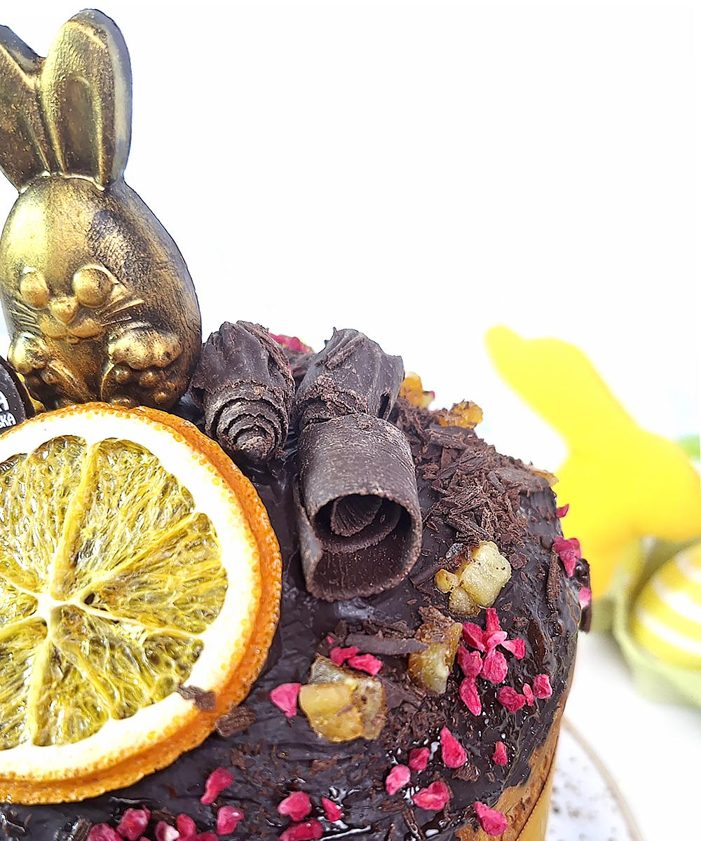 Шоколадне тісто доповнене ароматними апельсиновими цукатами, а зверху паска прикрашена витонченою шоколадною фігуркою, сублімованою малиною та сушеною часточкою апельсина.