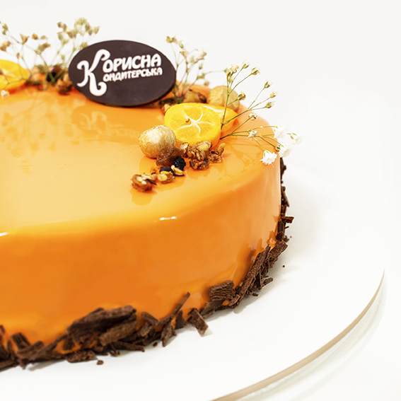 Яскравий торт на основі апельсинового бісквіту та прошарками апельсинового мусу і абрикосового пюре.