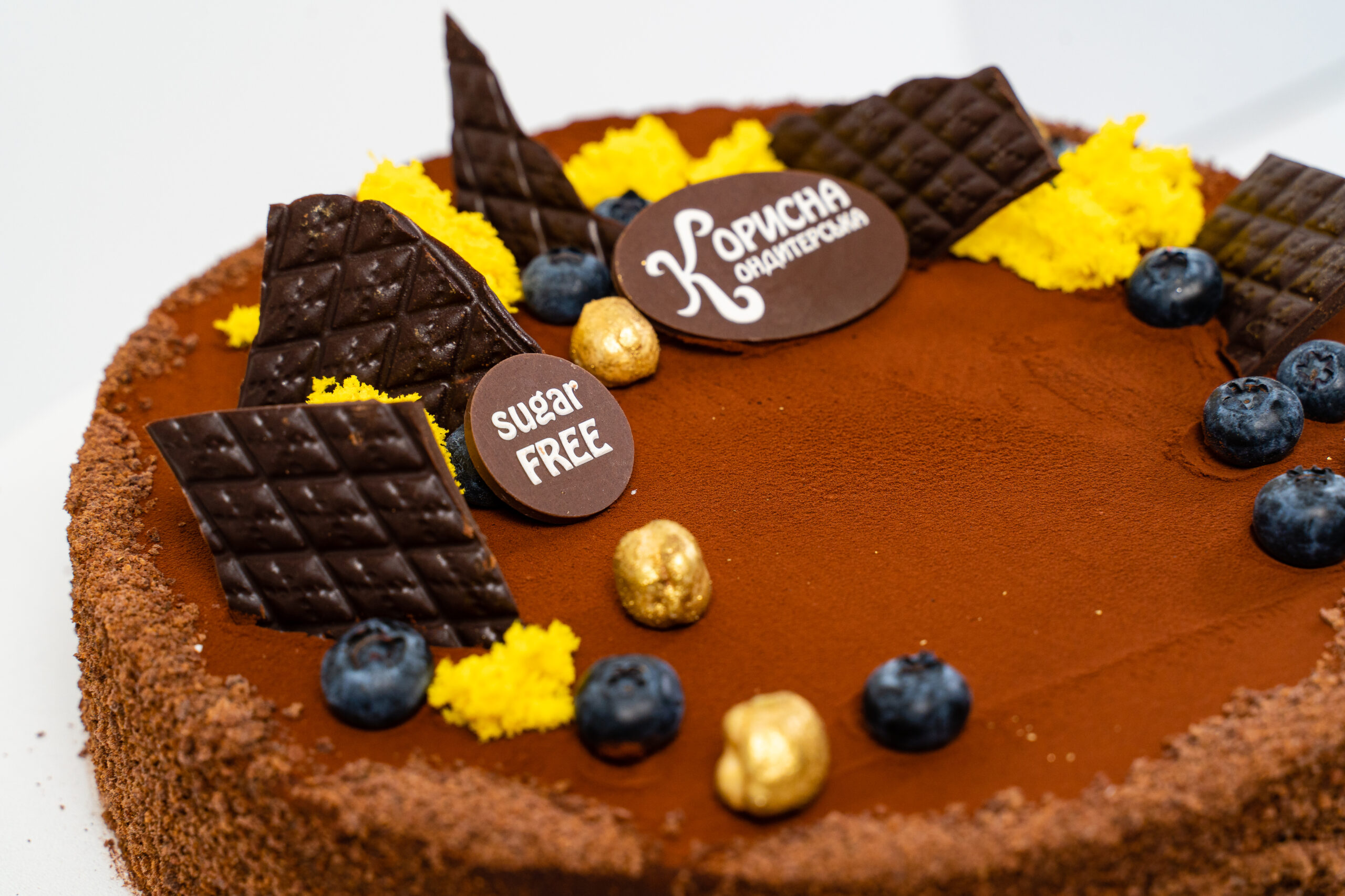Торт з ніжних шоколадних коржів, амарантового борошна, натурального вишневого соку і кави з вишнею. Просочений апельсиновим фрешем з банановим кремом. Не містить глютену, яєць і рослинних жирів.